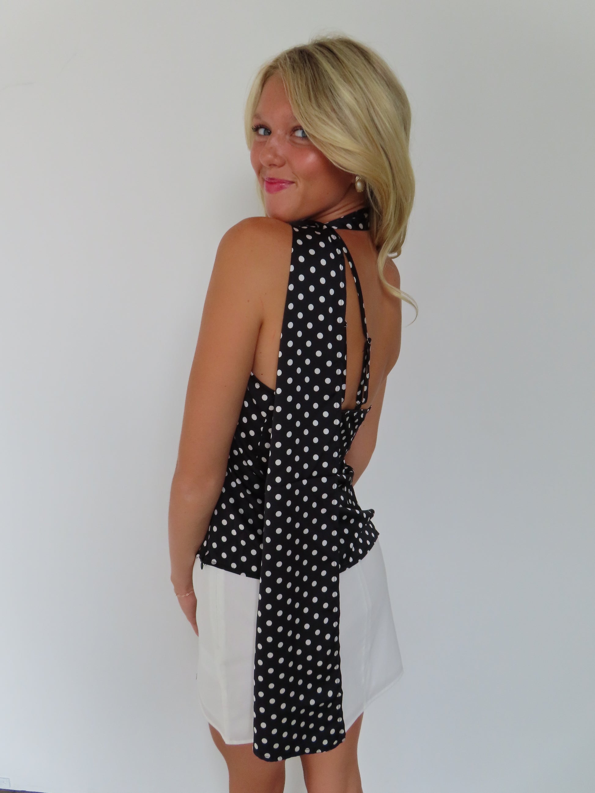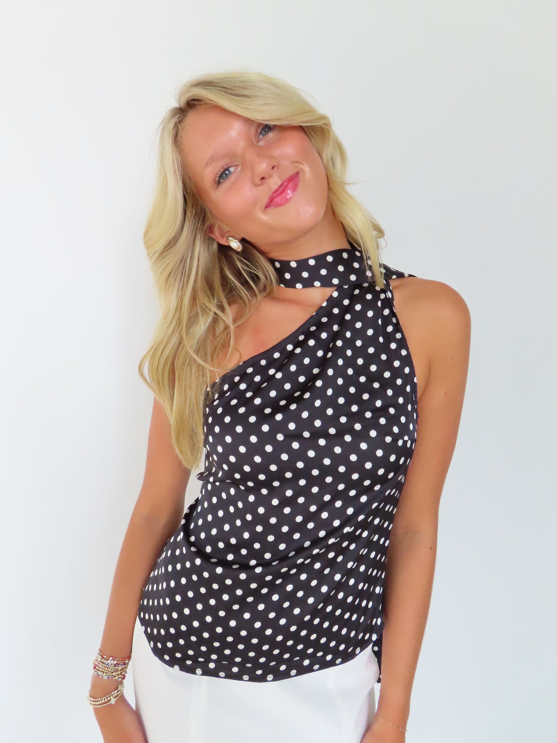Polka dot printed one shoulder top with scarf detail with side zipper