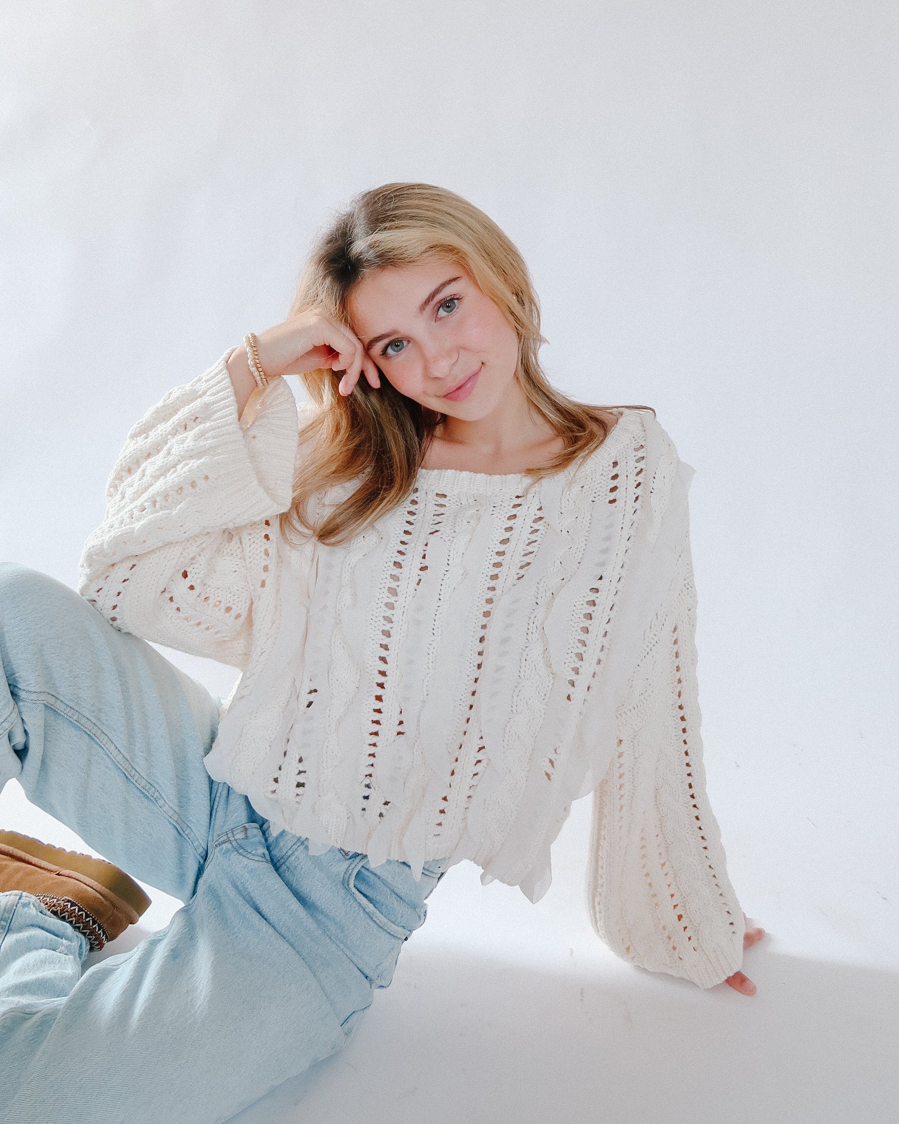 Boat neck long sleeve sweater top with ruffle detailing