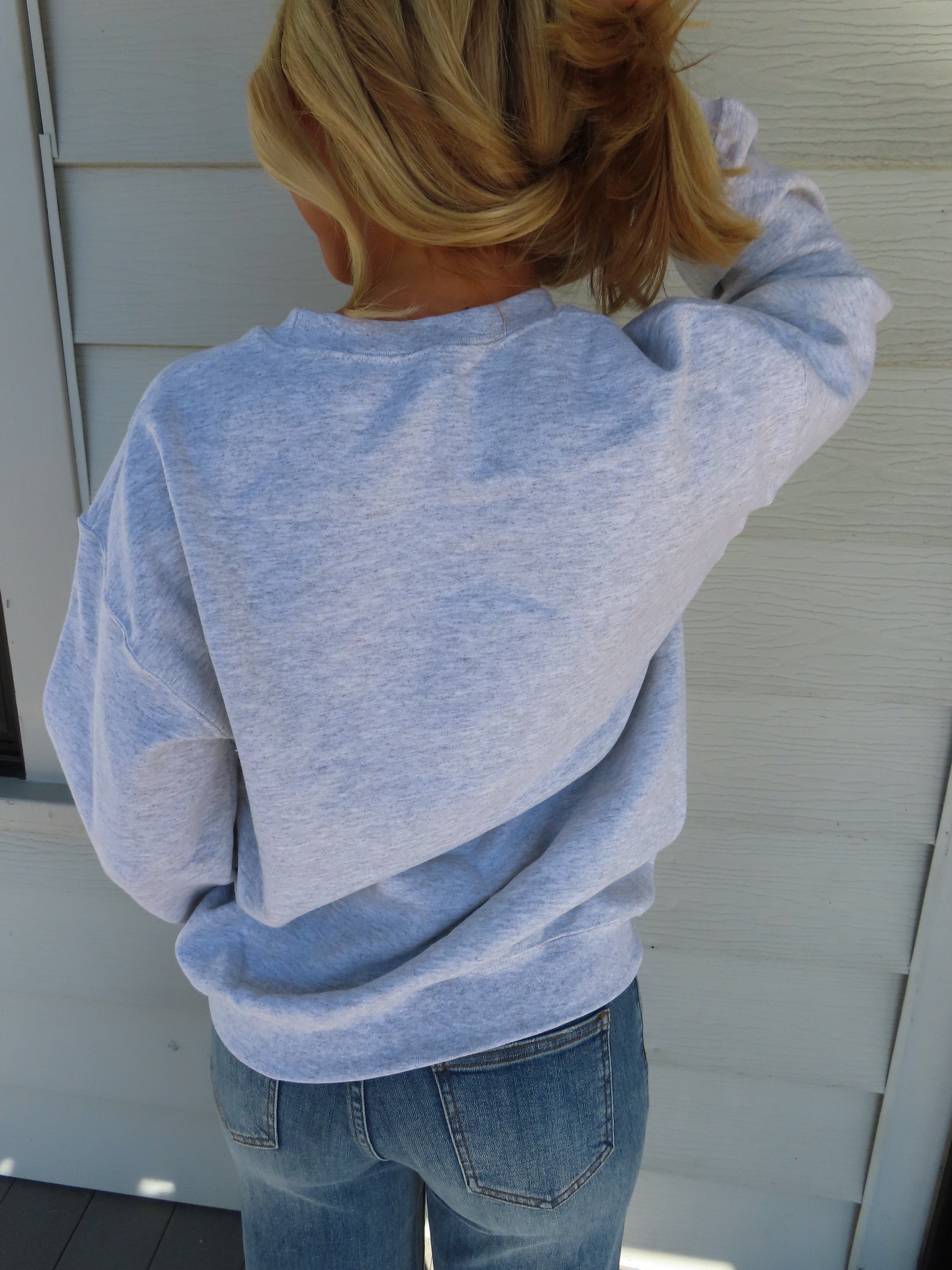 Grey crewneck with printed teddy bear, runs true to size